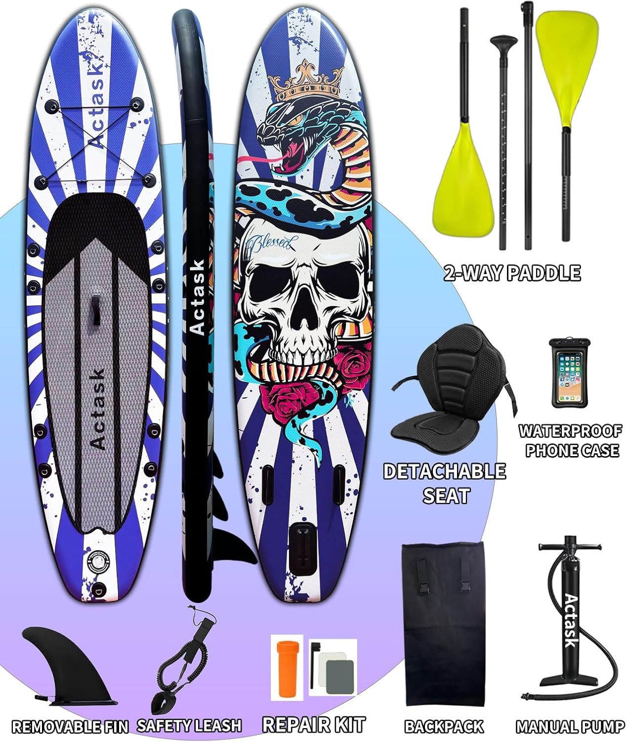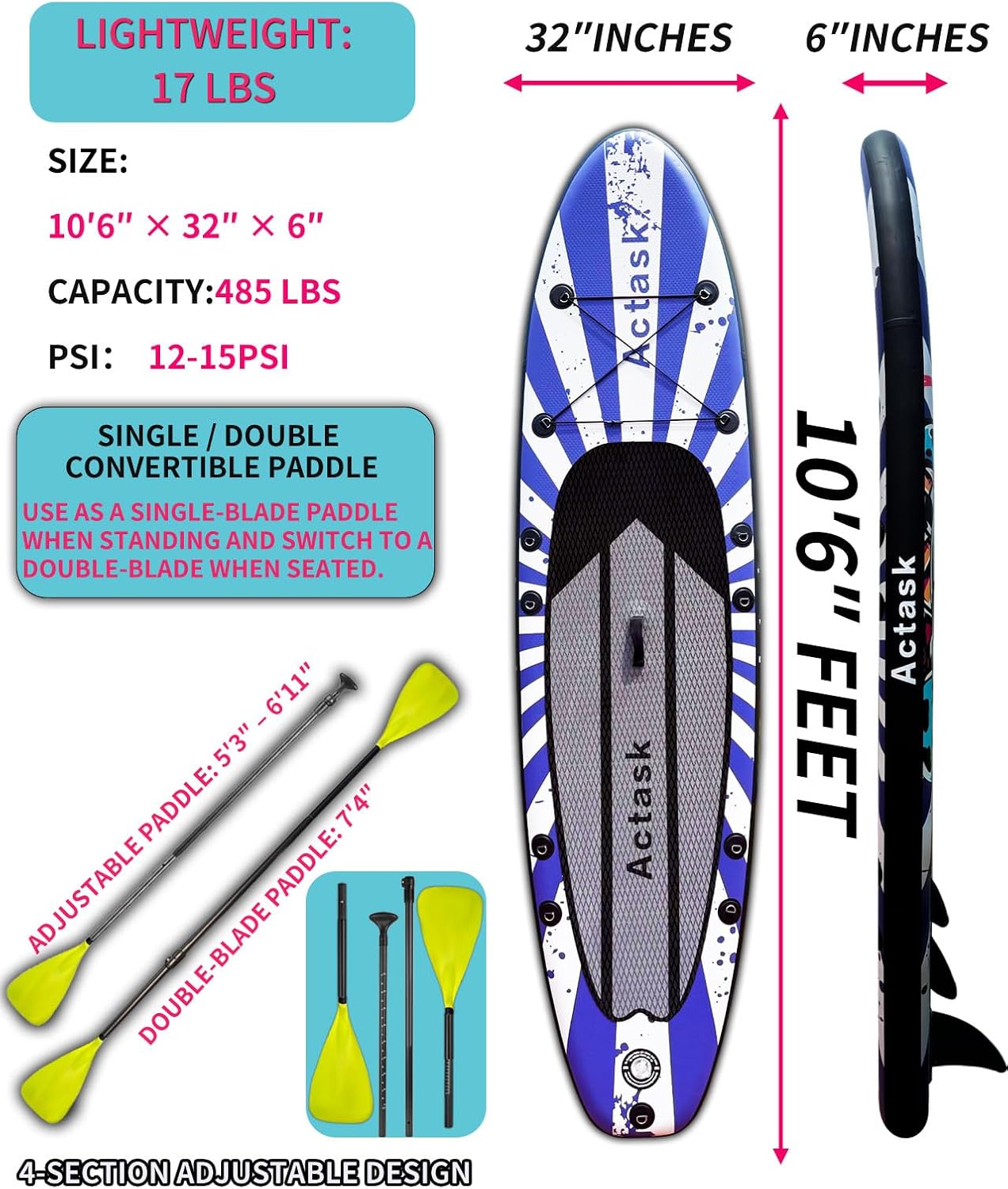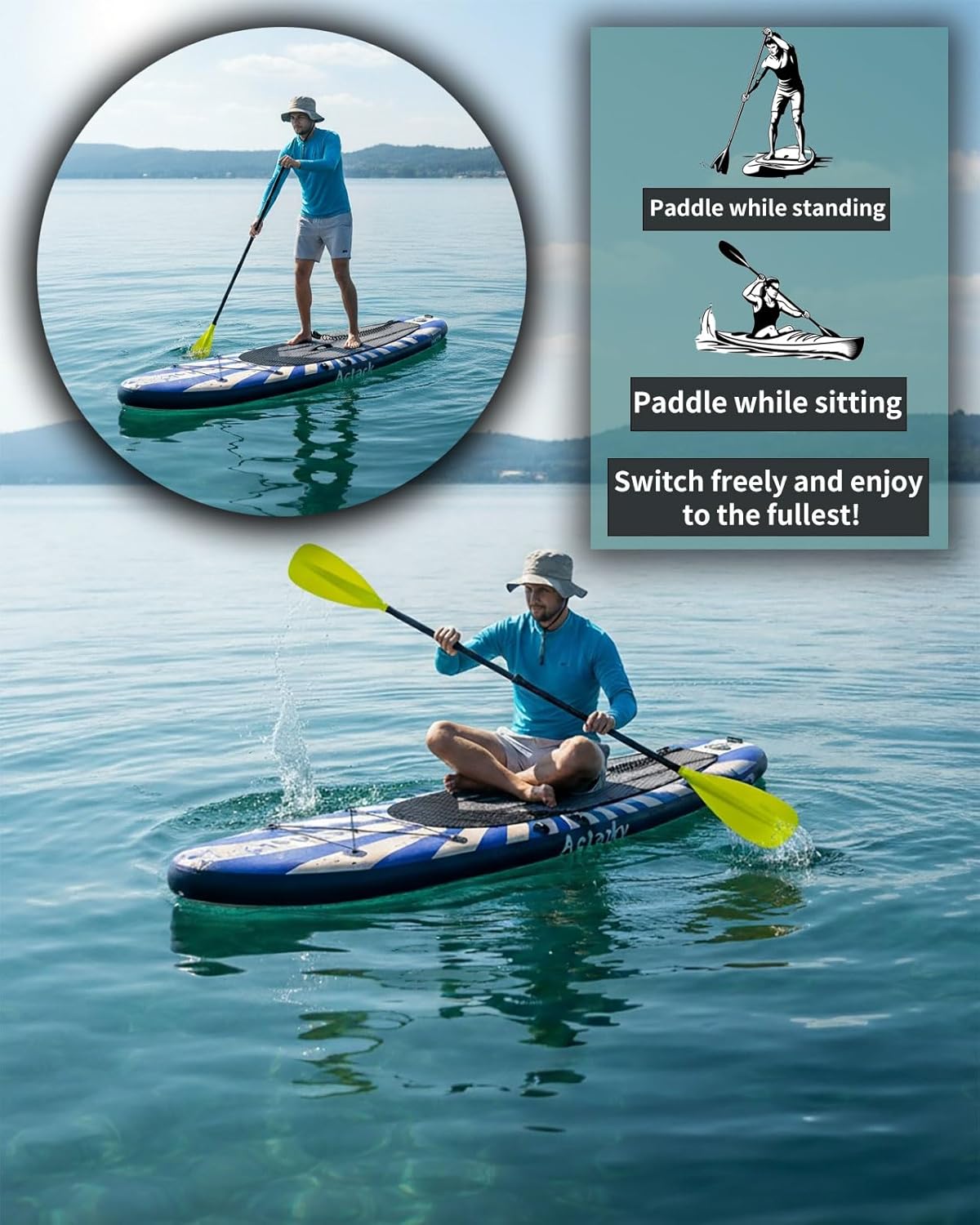 - This paddleboard comes with a convertible paddle that can switch between single-blade and dual-blade modes, allowing you to paddle while standing or sitting — very practical and versatile.